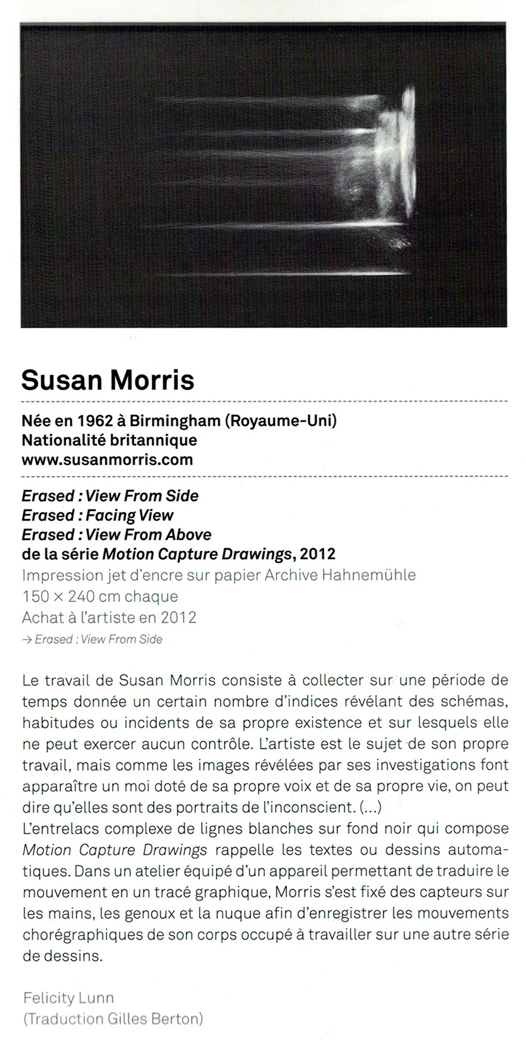 Susan Morris's work consists of collecting, over a given period of time, a certain number of clues revealing patterns, habits, or incidents in her own life over which she has no control. The artist is the subject of her own work, but since the images revealed by her investigations reveal a self with its own voice and life, they can be said to be portraits of the unconscious. (...) The complex interlacing of white lines on a black background that composes Motion Capture Drawings is reminiscent of automatic texts or drawings. In a studio equipped with a device that translates movement into a graphic trace, Morris attached sensors to her hands, knees, and neck to record the choreographic movements of her body as she worked on another series of drawings. Felicity Lunn